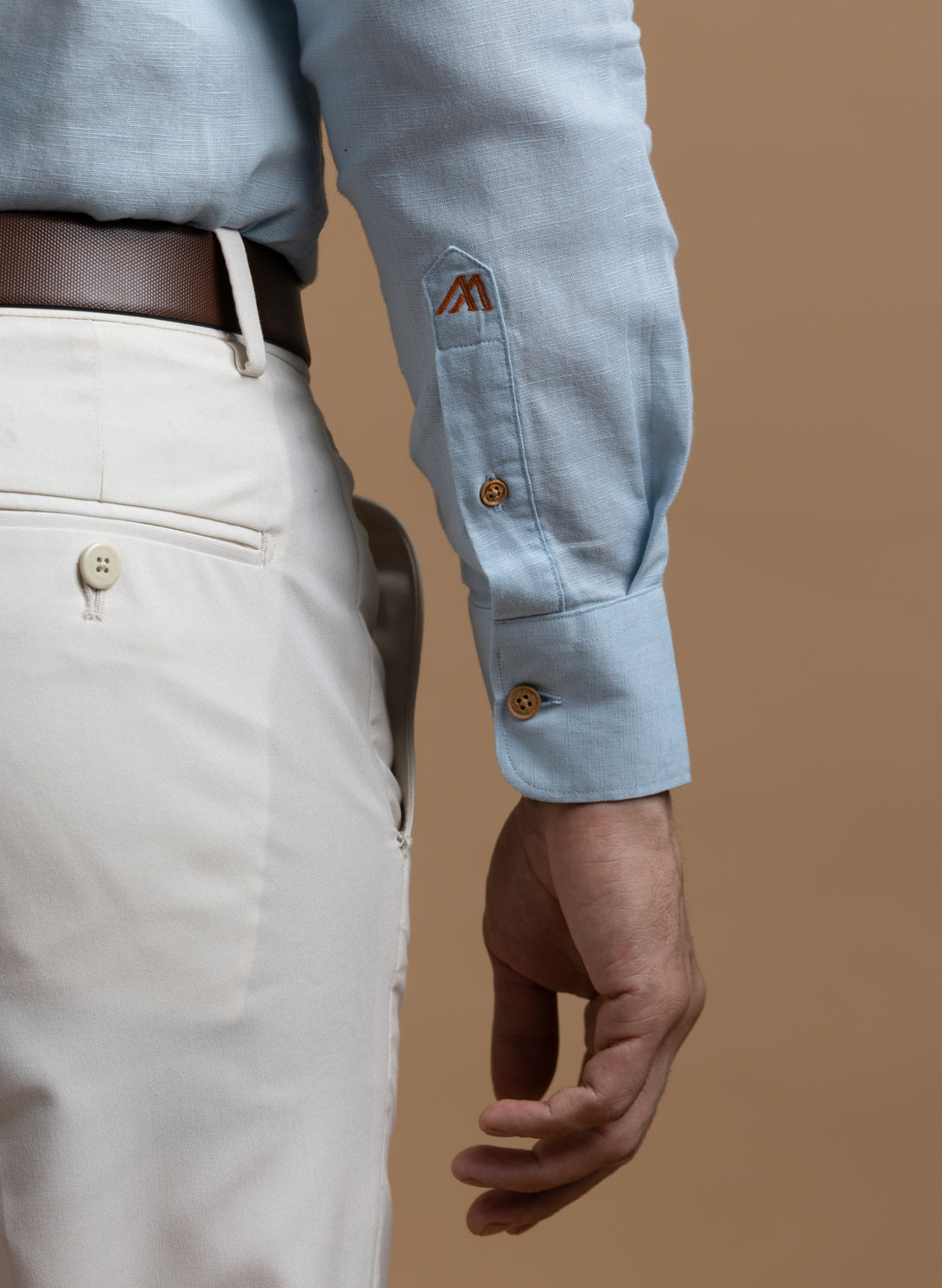 Summer's effortless essential. The 65% cotton/35% linen blend keeps you cool while developing a beautiful natural drape over time. The sky blue hue pairs perfectly with white or khaki for warm-weather sophistication.