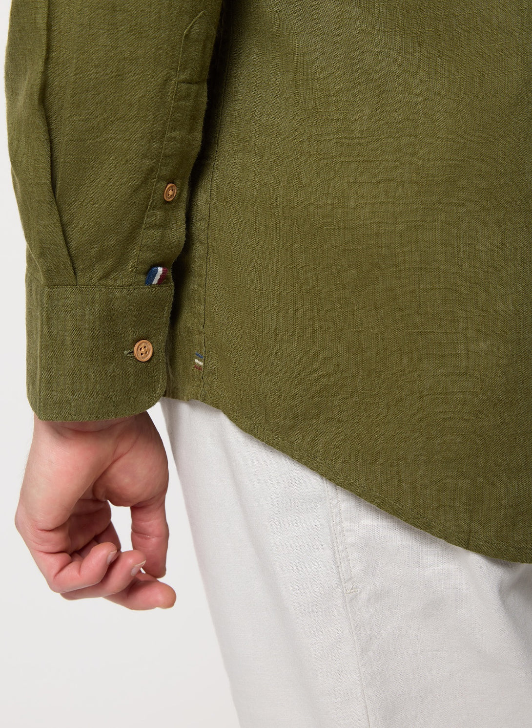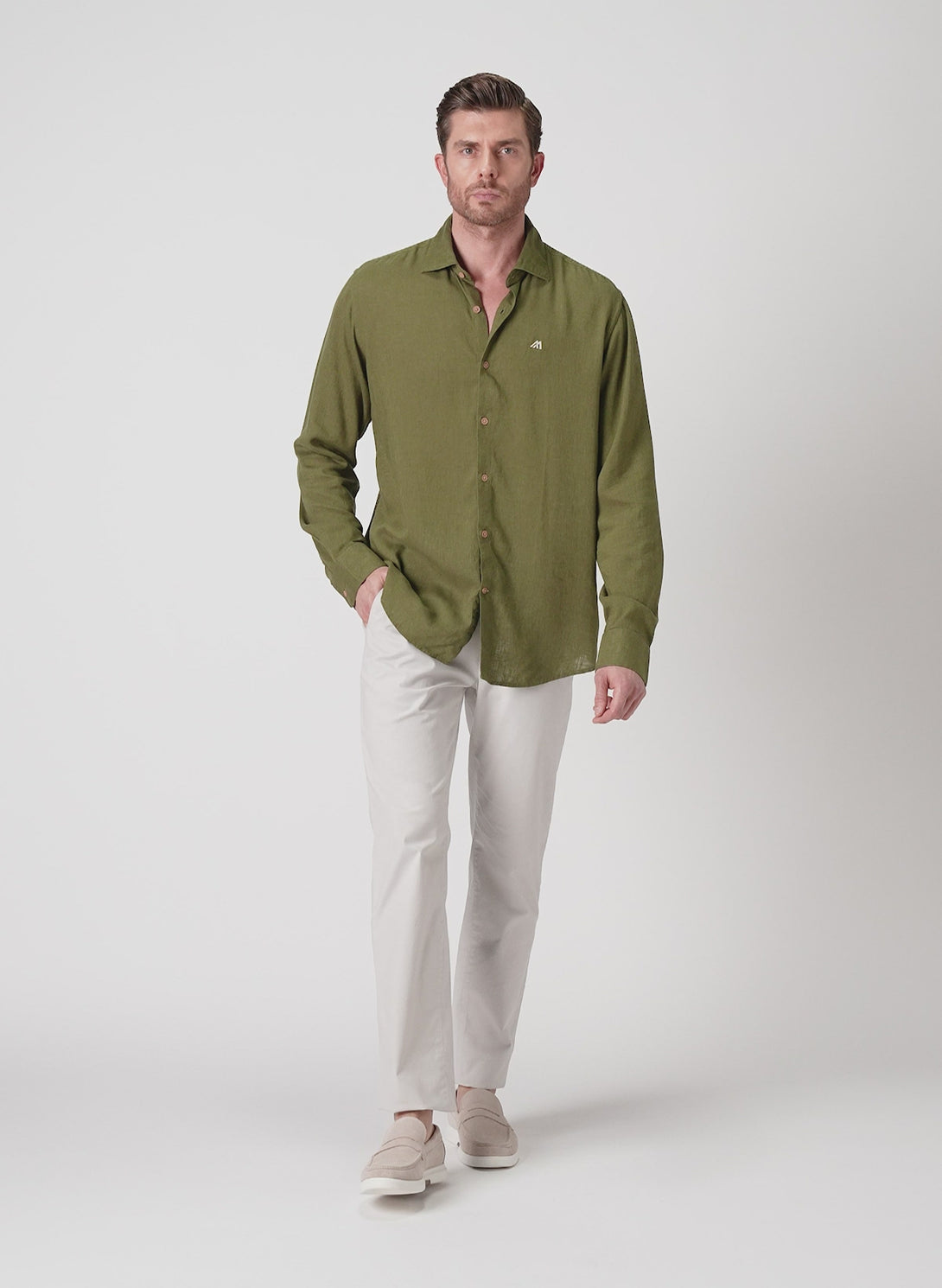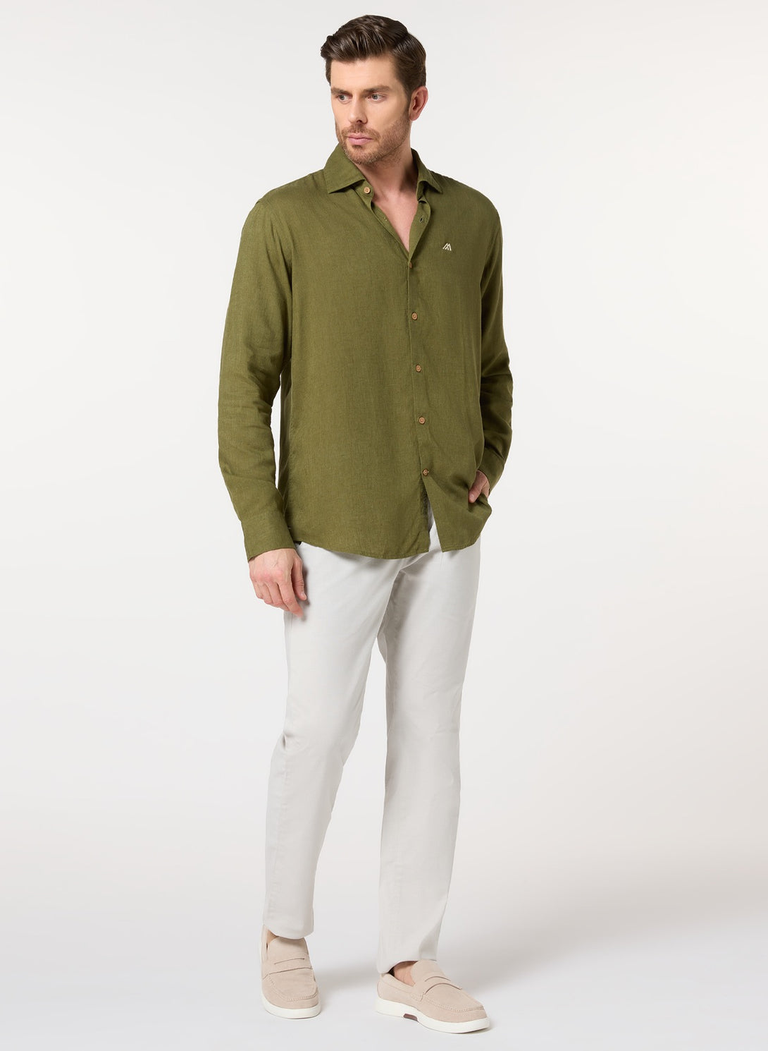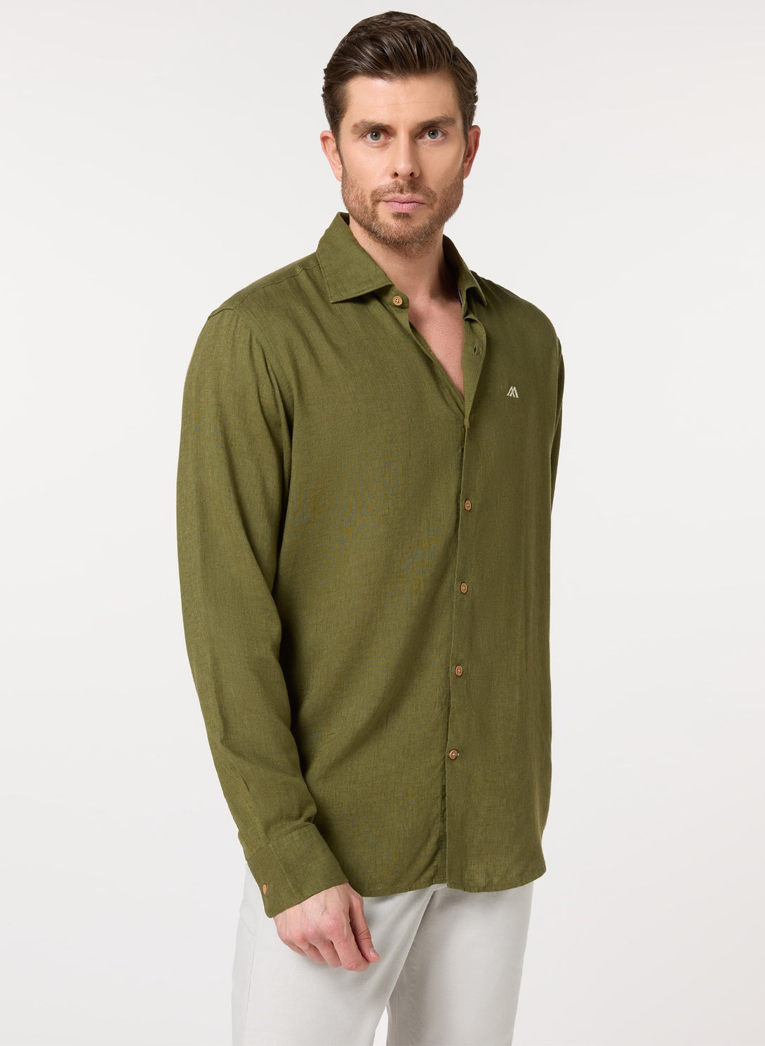 Nature-inspired sophistication. The olive green hue pairs beautifully with neutrals, while the lyocell-linen blend offers eco-friendly comfort. The button-down collar keeps it polished.