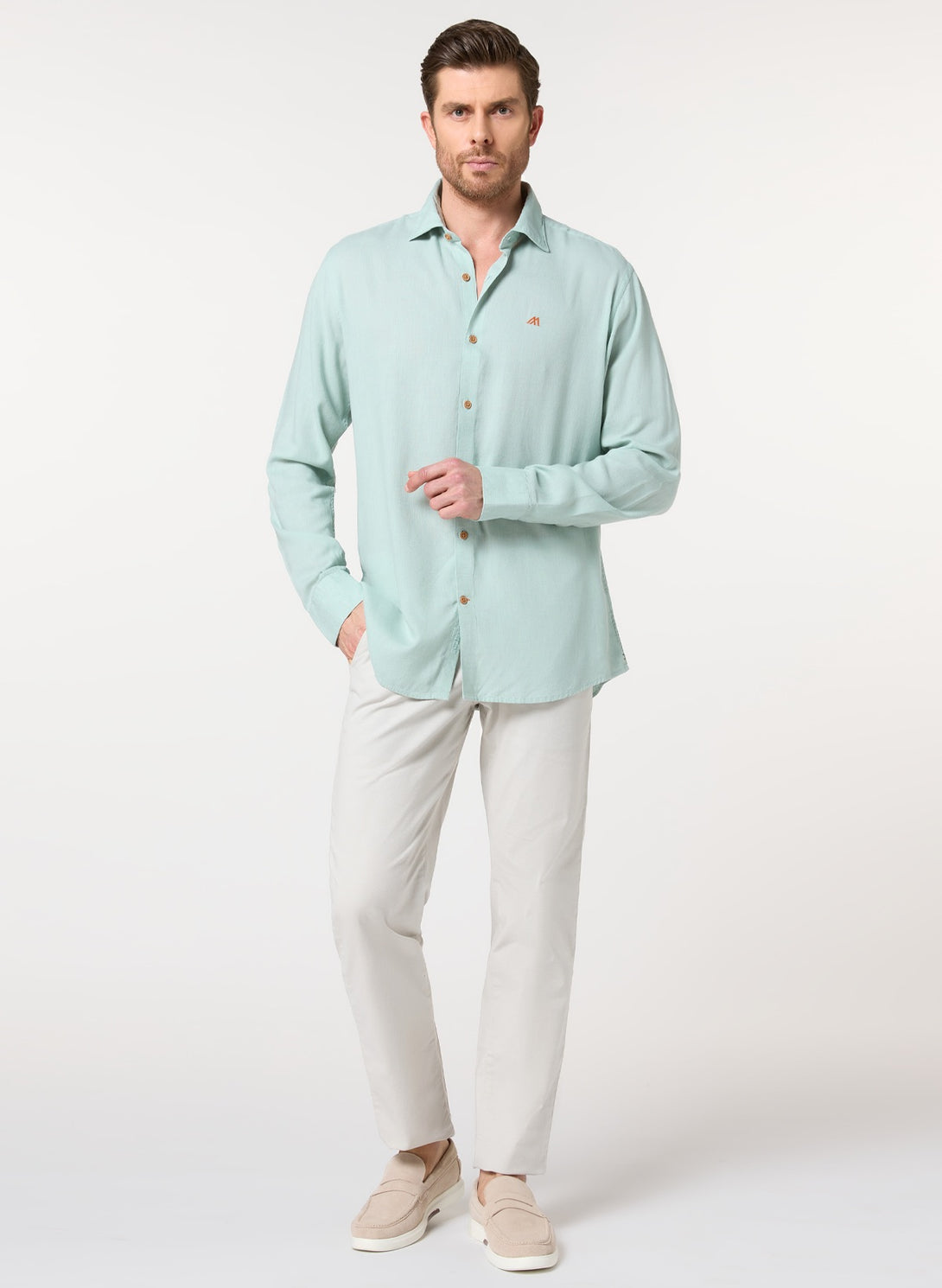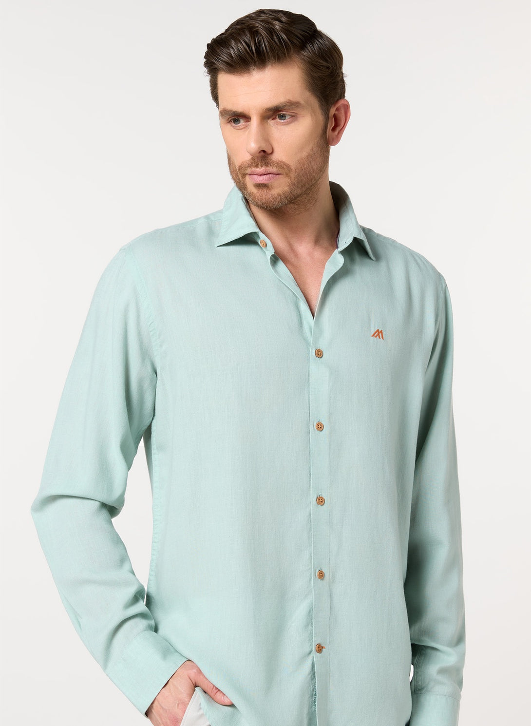 Cool, crisp, and refreshing. The light sea green hue evokes coastal vibes, while the lyocell-linen blend offers superior breathability and drape. Perfect for beating the heat in style.