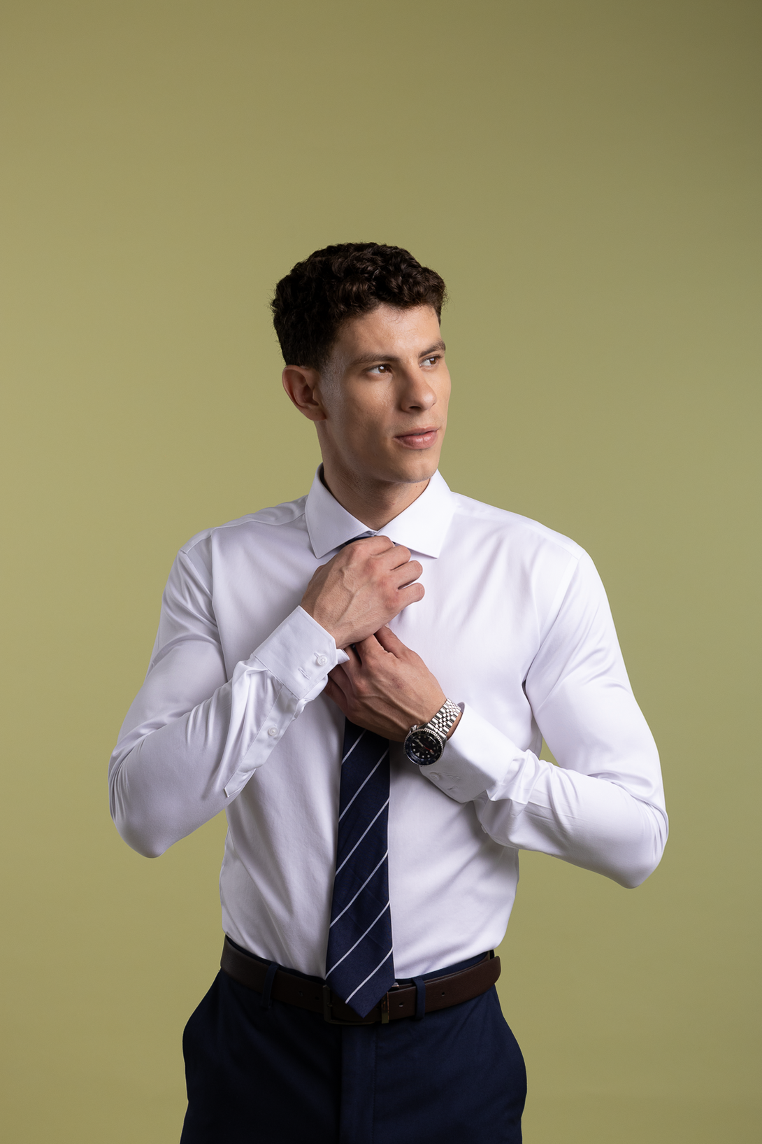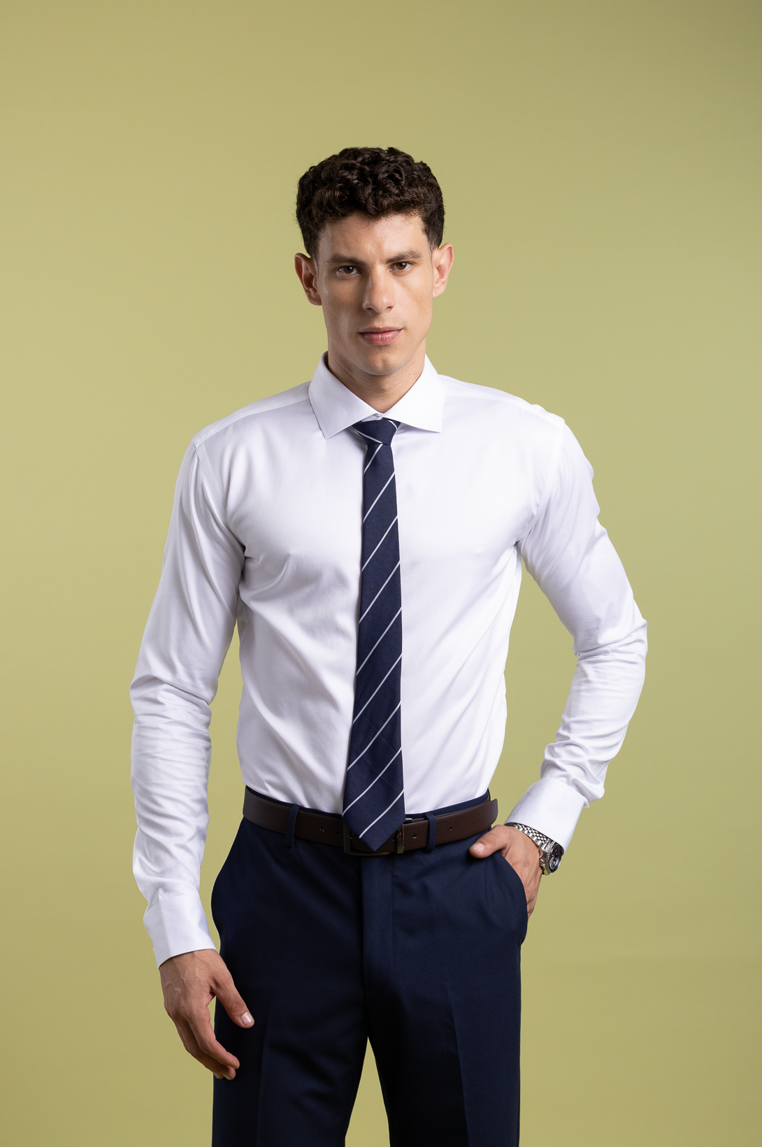 Crisp perfection every time. The 100s cotton non-iron construction stays sharp all day, while the semi-cutaway collar adds modern polish. Your go-to for important occasions.